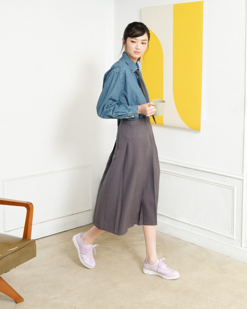 以牛仔衬衫、领带、百褶长裙组成的知识份子风造型,选择能完美融入蓝紫、灰黑色阶中的2024巴黎奥运浪漫紫,轻鬆增添了让人存在感更为强烈的率性态度。